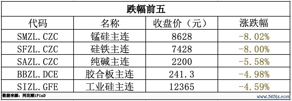 3日,国内商品期货收盘,多数下跌。锰硅、硅铁均跌幅8%,纯碱跌超5%,工业硅跌超4%,氧化铝、聚氯乙烯(PVC)、沪银、甲醇、苹果跌超3%;生猪涨近2%。