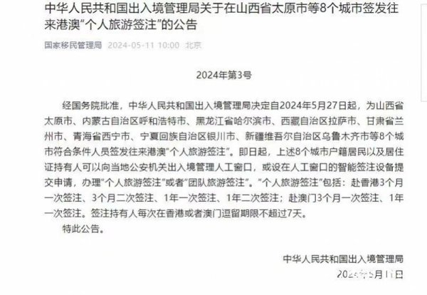 经国务院批准,中华人民共和国出入境管理局决定自2024年5月27日起,为山西省太原市、内蒙古自治区呼和浩特市、黑龙江省哈尔滨市、西藏自治区拉萨市、甘肃省兰州市、青海省西宁市、宁夏回族自治区银川市、新疆维吾尔自治区乌鲁木齐市等8个城市符合条件......
